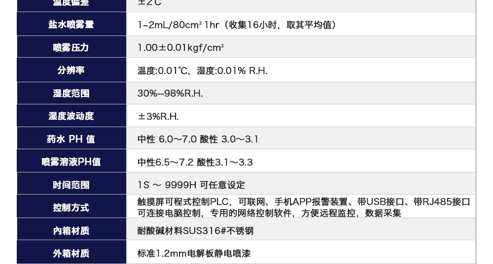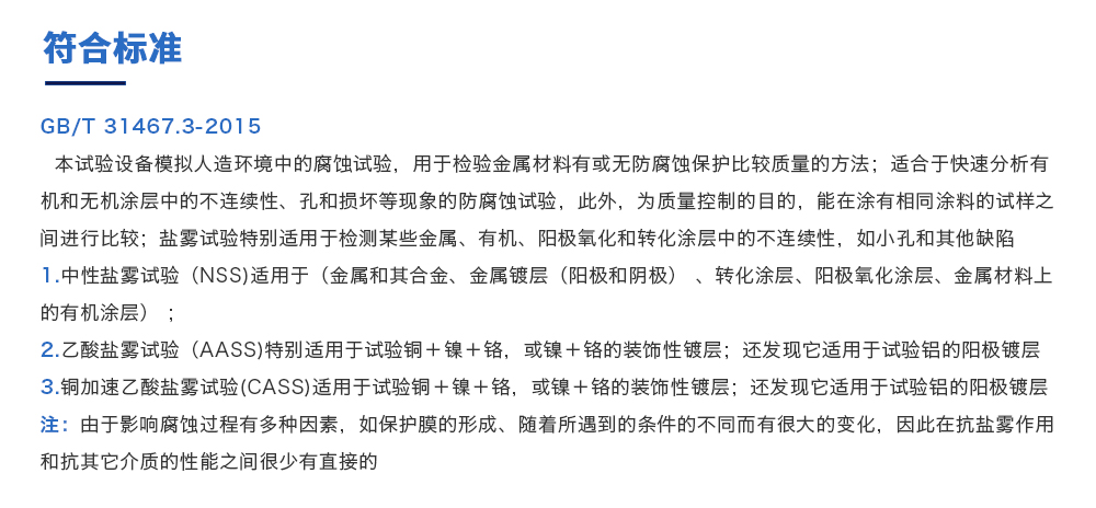 用途:復(fù)合鹽霧試驗(yàn)箱是測(cè)試蓄電池包或系統(tǒng)外殼在一定濃度下放置一定時(shí)間,其耐腐蝕程度同時(shí)也可用于各種材質(zhì)之表面經(jīng)電鍍、陽(yáng)極處理、噴涂、防銹油等腐蝕處理后,測(cè)試其制品之耐蝕