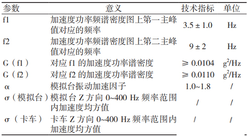 模擬運輸臺的設(shè)計參數(shù)主要依據(jù)《QJ/T 815.2-94產(chǎn)品公路運輸加速模擬試驗方法》[3]設(shè)定。該標準中規(guī)定了模擬運輸臺的關(guān)鍵技術(shù)指標,見表1。