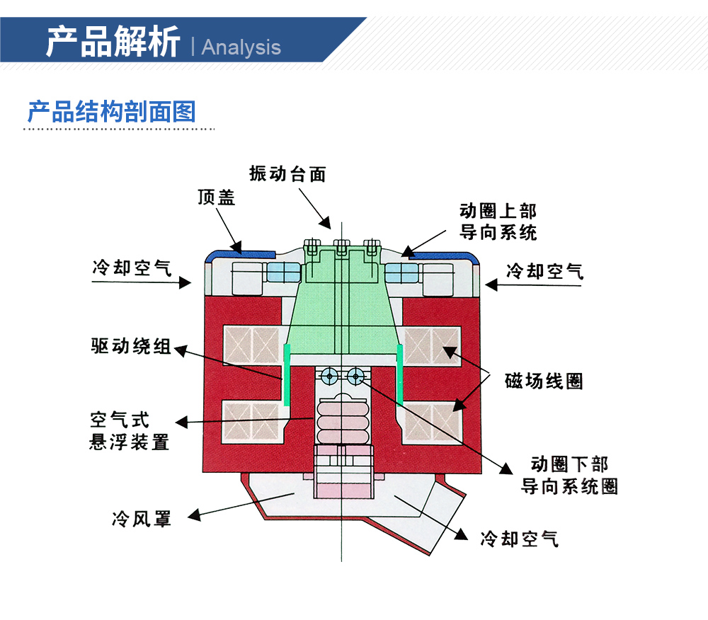 性能特點:●強制風冷 ●正弦激振力范圍: 1kN ~ 70kN●兩倍的正弦沖擊力(2噸以上可選三倍) ●輕質動圈,優化設計,耐振性能強●中心氣囊承載能力強,低頻性能好 ●可配置水平滑臺●風機冷卻效果好,噪音低 ●使用頻率可從1Hz開始●隨機與正弦激振力1:1 ●位移峰峰值最大可達100mm●耳軸氣囊隔震效果好 ●雙磁路設計,漏磁低,磁場均勻●正弦、隨機、沖擊等試驗功能 ●高效率、高可靠性功率放大器系統特點:◎一階共振頻率高、使用頻率寬優化的動圈骨架結構設計,特別是對傳統結構的動圈骨架傳力角板等薄弱環節進行增強設計,有效提高了傳力剛度;采用膠接與螺釘連接的復合固定繞線環筒和繞線環筒增強膠孔的新結構,增強了繞組的剛度。顯著提高了動圈的一階共振動頻率,超過了國際同類產品。◎動圈繞組可靠性高獨創的動圈繞組加強環的新結構和新工藝,顯著提高了動圈繞組工作在大推力、高加速度振動、沖擊和高溫環境中的耐振可靠性。◎風冷效率高創新的電動臺冷卻風道設計:改進了進風結構,上磁環用長槽型進風道取代圓孔型進風道;勵磁線圈采用蜂窩式風道、中磁環采用雙層風流式風道、下磁環采用斜楔型風道等新結構,顯著提高了冷卻效果。◎冷卻風機冷卻風機具有獨特的風道等結構設計,風機冷卻效果好,噪音低。◎水平和垂直試驗帶水平滑臺的電動振動臺可以用于水平和垂直試驗,兩個方向的切換方式簡單,翻轉方便。◎采用IGBT模塊功放采用性能可靠的MOSFET和IGBT模塊,具有很高的穩定性和可靠性。◎安全性能產品符合歐洲標準測試要求,在功放上裝有緊急停止開關,有效應對突發事件。符合美國UL和CE安全要求。